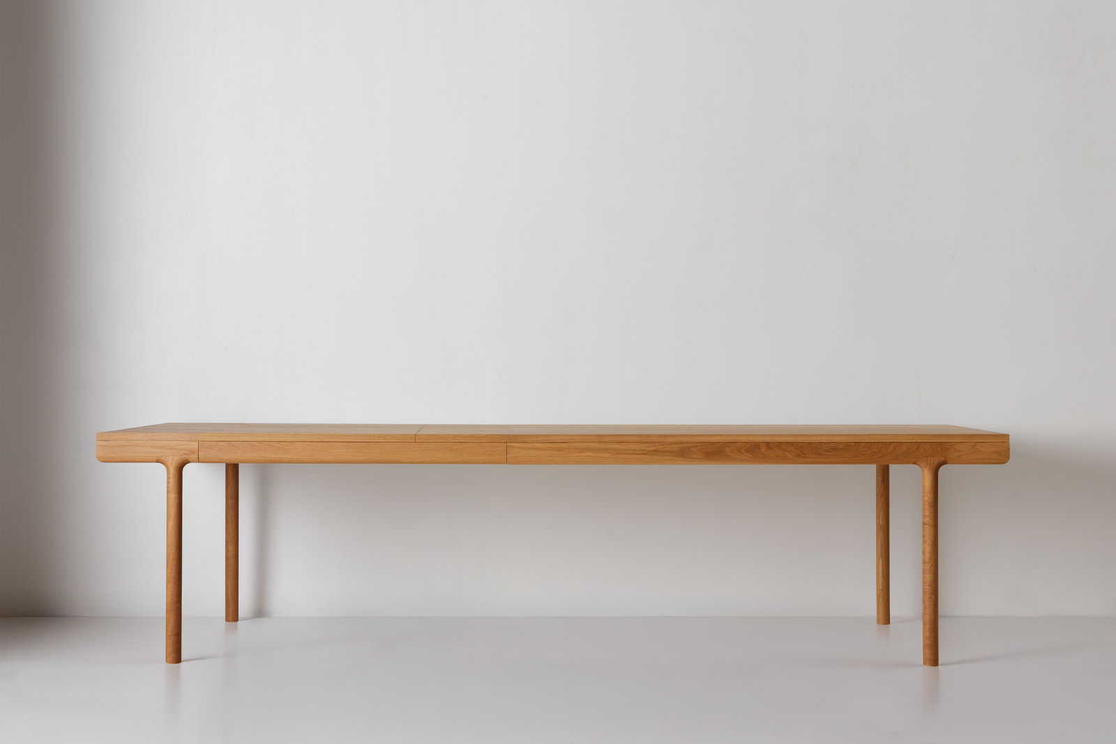 Cut from an expanse of solid white oak, the Highland Extension Dining Table is defined by its generous scale and sculptural presence. Softly curving legs and blended joinery introduce a measure of softness to the table’s otherwise monolithic form. A concealed butterfly mechanism allows the leaves to nest seamlessly beneath the surface, expanding the table from six to ten place settings with refined precision. It is finished with Kalon’s Bare Finish—our premium organic oil-wax blend that preserves the natural character of the wood. The table is also offered in a fixed version or configured as a desk.