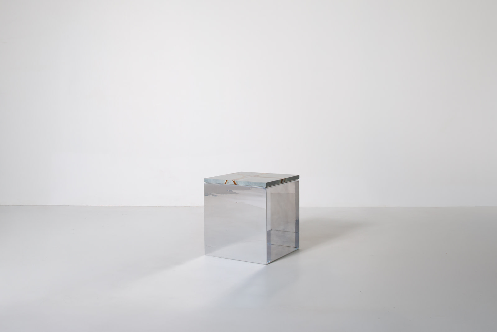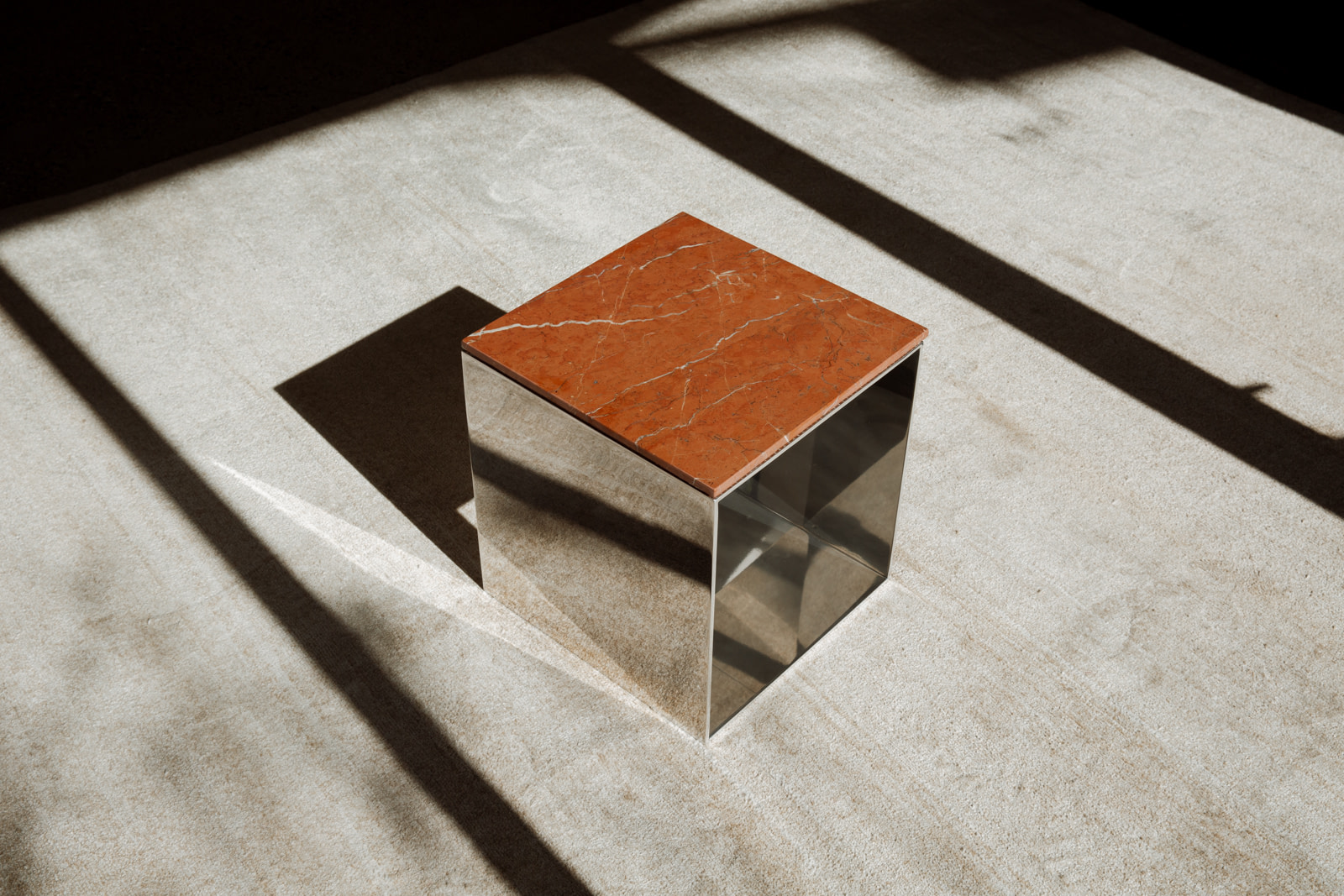 The Material Studies II Cubes translate the collection’s dialogue between reflection and density into a more compact scale. Each variation pairs mirrored aluminum with a richly pigmented stone top, forming a precise, elemental volume. Open on two sides, v.1 forms a clean, open volume that frames and reflects its surroundings.