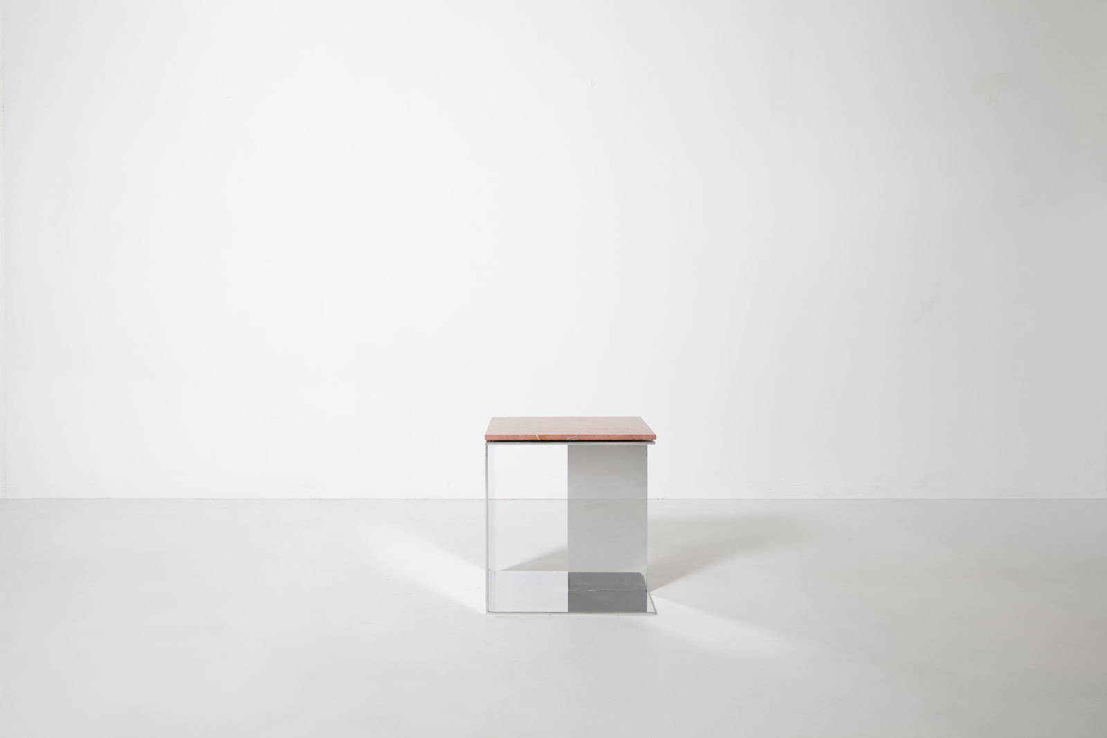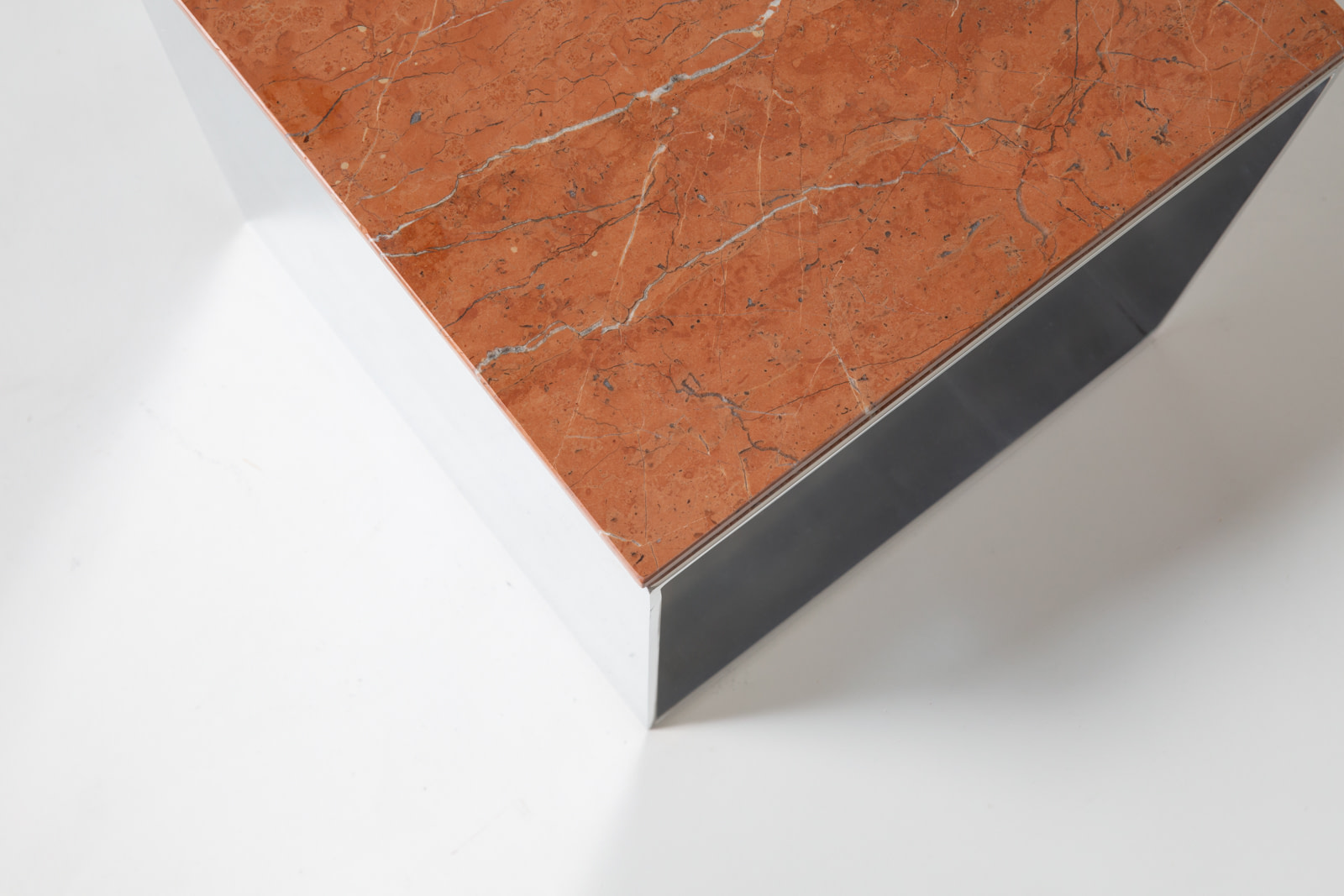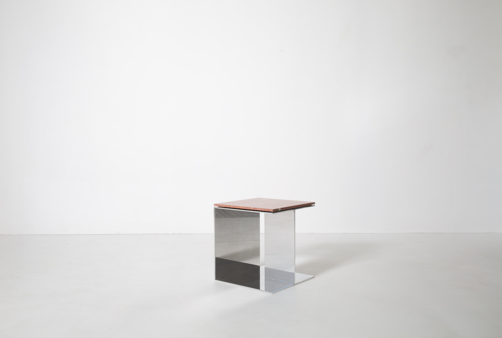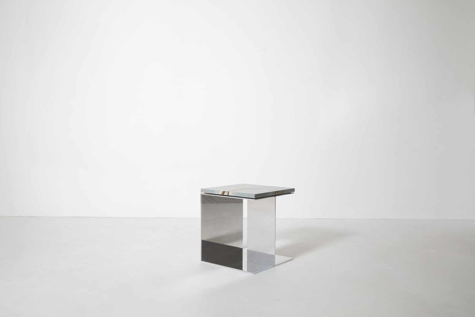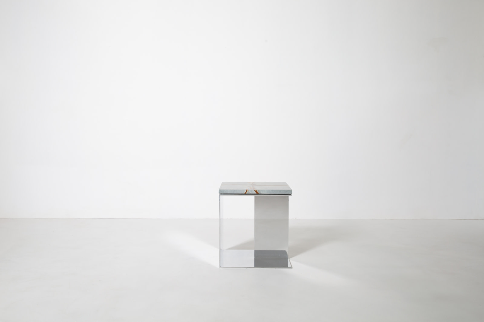 The Material Studies II Cubes translate the collection’s dialogue between reflection and density into a more compact scale. Each variation pairs mirrored aluminum with a richly pigmented stone top, forming a precise, elemental volume. Open on three sides with an internal partition, v.4 introduces a central support that adds depth and layered reflection.