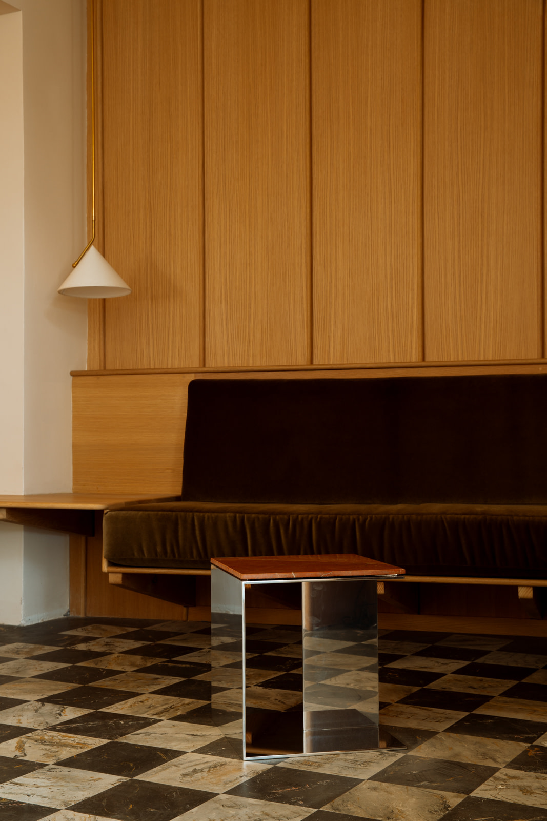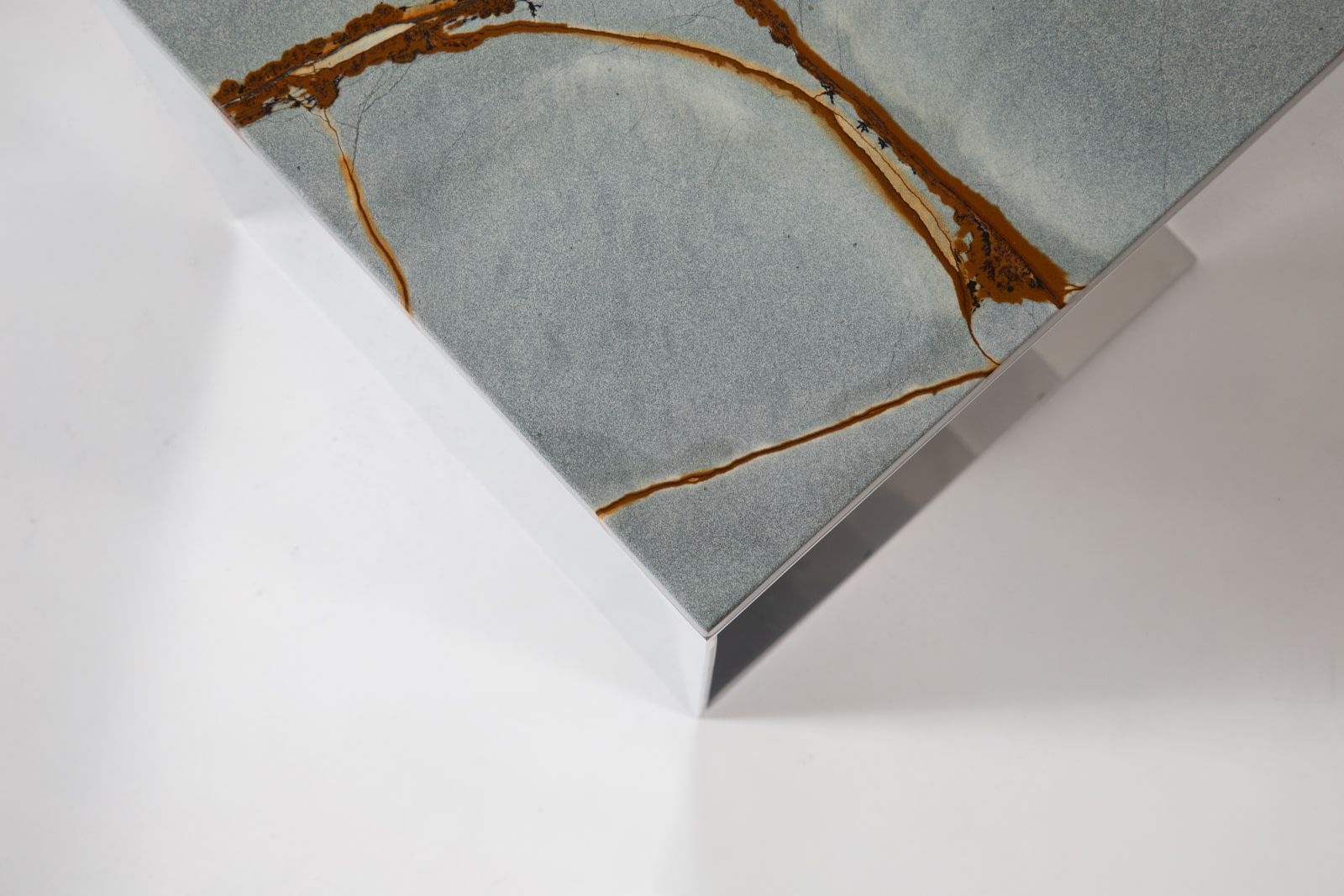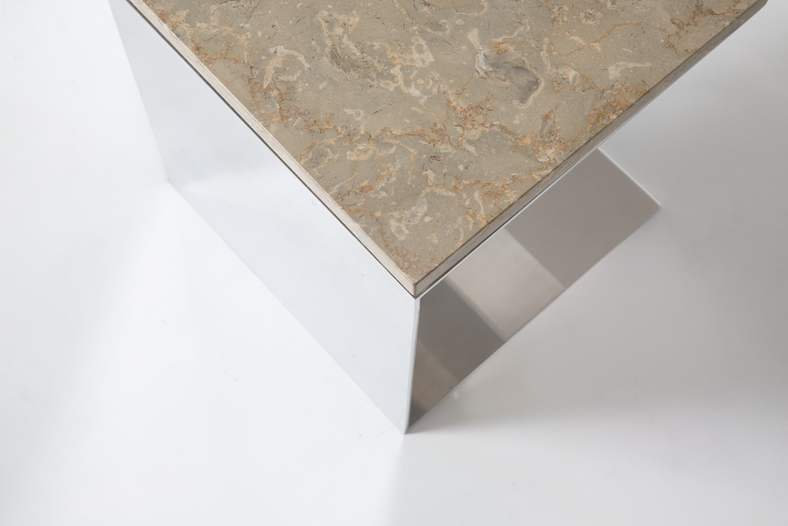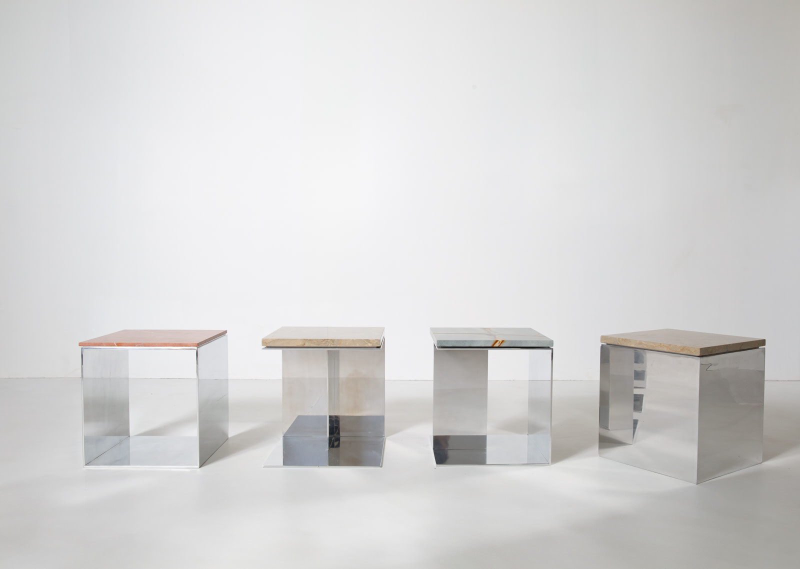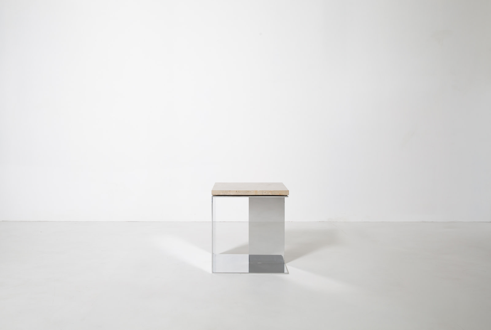 The Material Studies II Cubes translate the collection’s dialogue between reflection and density into a more compact scale. Each variation pairs mirrored aluminum with a richly pigmented stone top, forming a precise, elemental volume. Open on three sides with an internal partition, v.4 introduces a central support that adds depth and layered reflection.