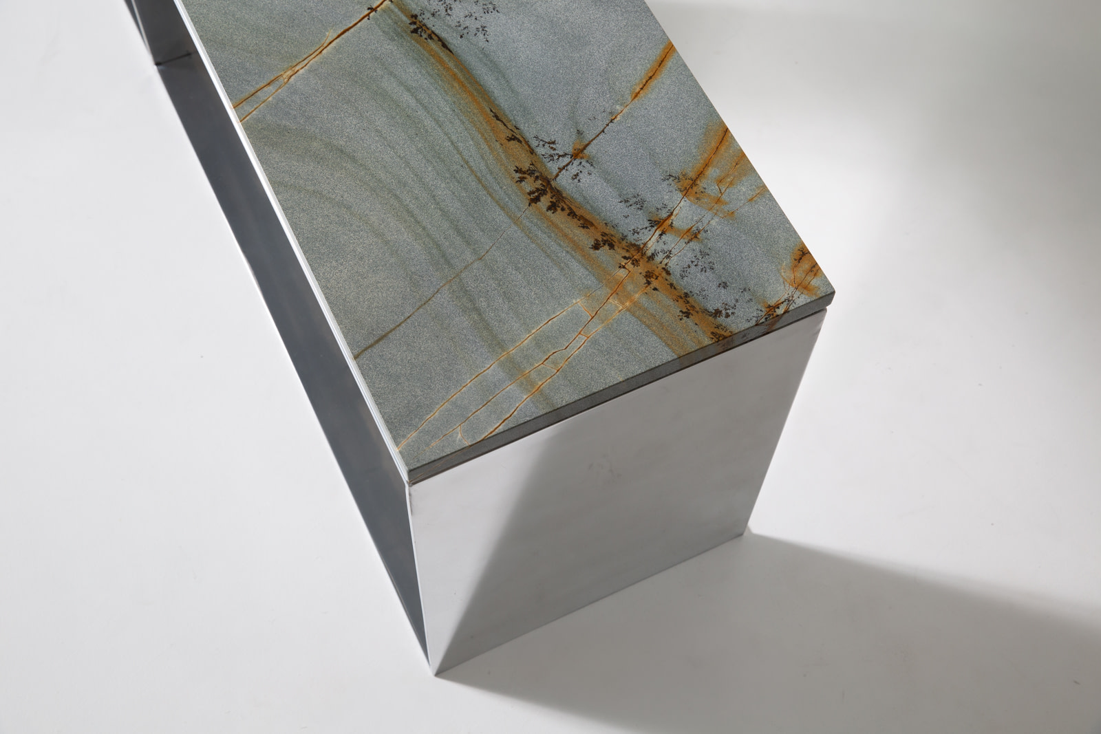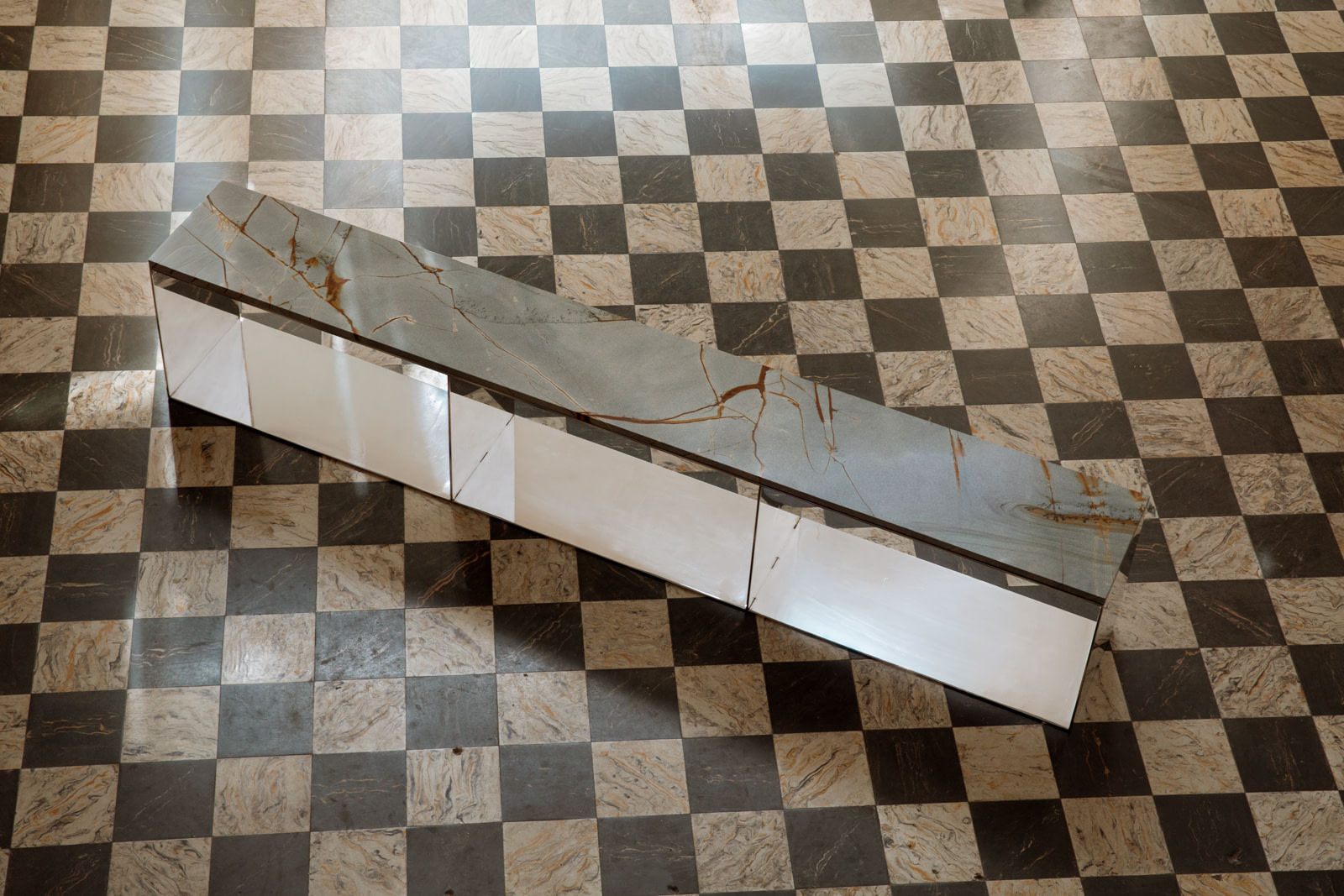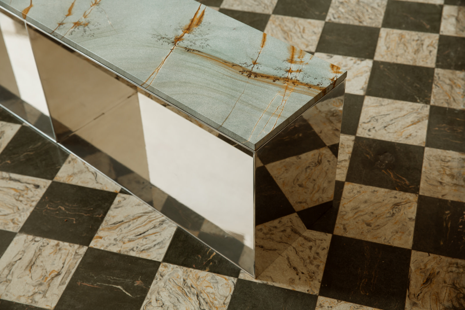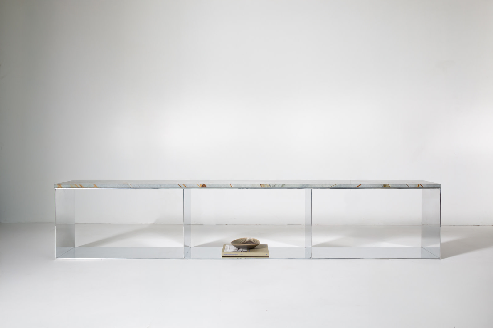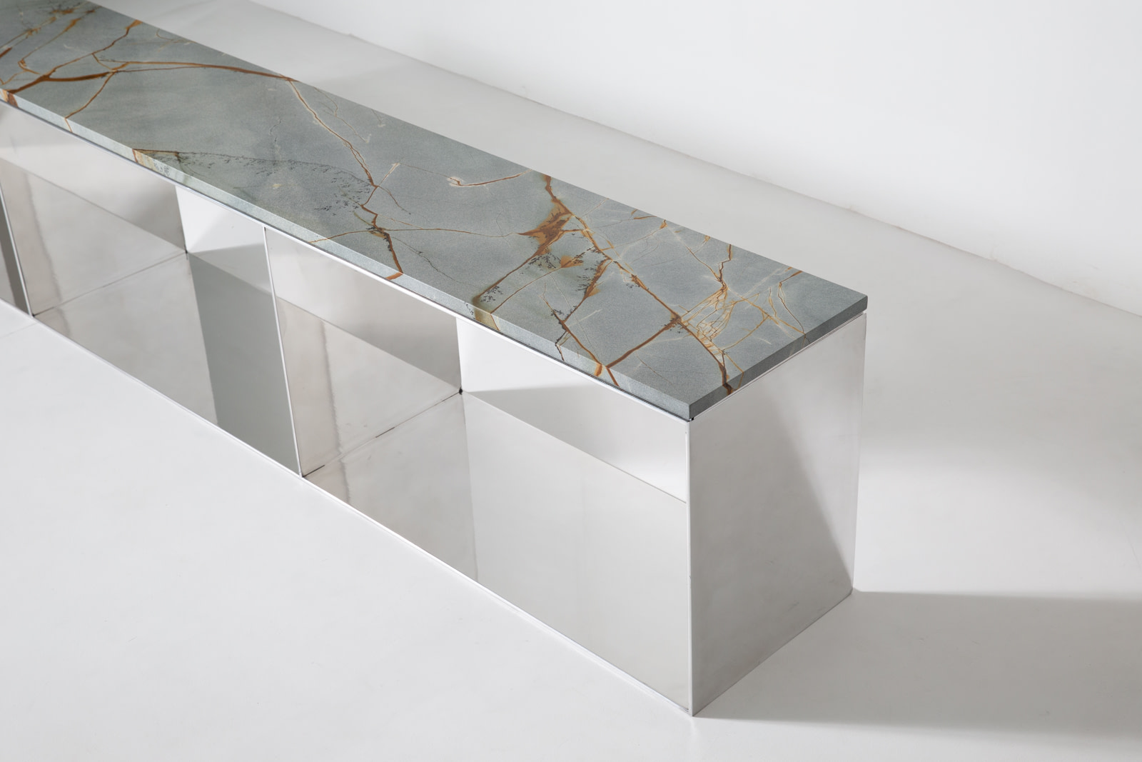 The Material Studies II Case Bench combines mirrored aluminum with a continuous slab of quartzite or marble. Its elongated form is divided into three open compartments, establishing a measured rhythm beneath the stone.