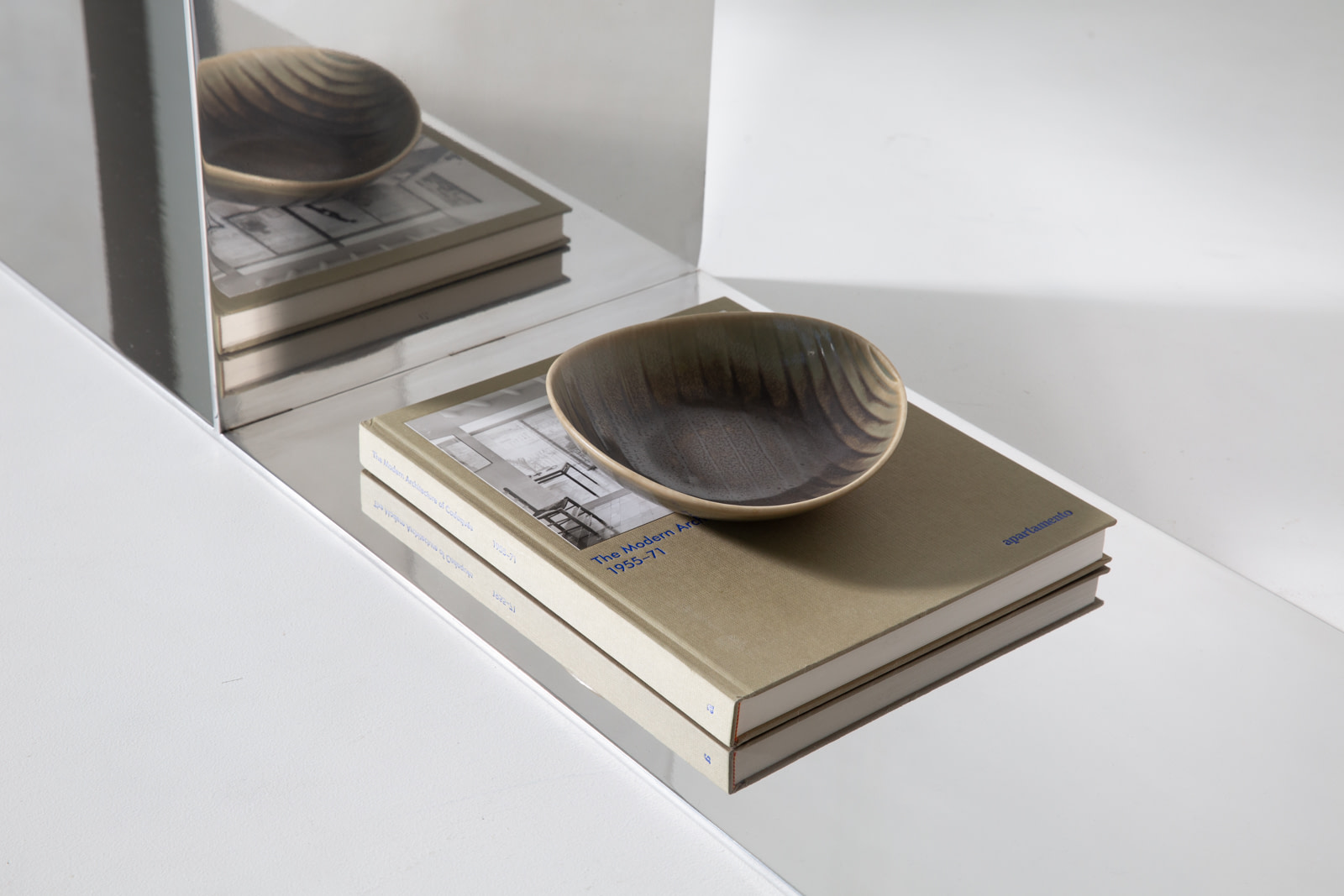 The slender mirrored frame shifts the perception of mass, at times dissolving into its surroundings as it reflects the objects it holds and extends interior space. Books, vessels, and sculpture become part of its surface—multiplied and reframed within the silvered structure. Above, richly pigmented stone introduces density and saturated tone, giving the piece weight and definition.